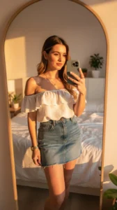 8. Off-Shoulder Top + Denim Skirt
