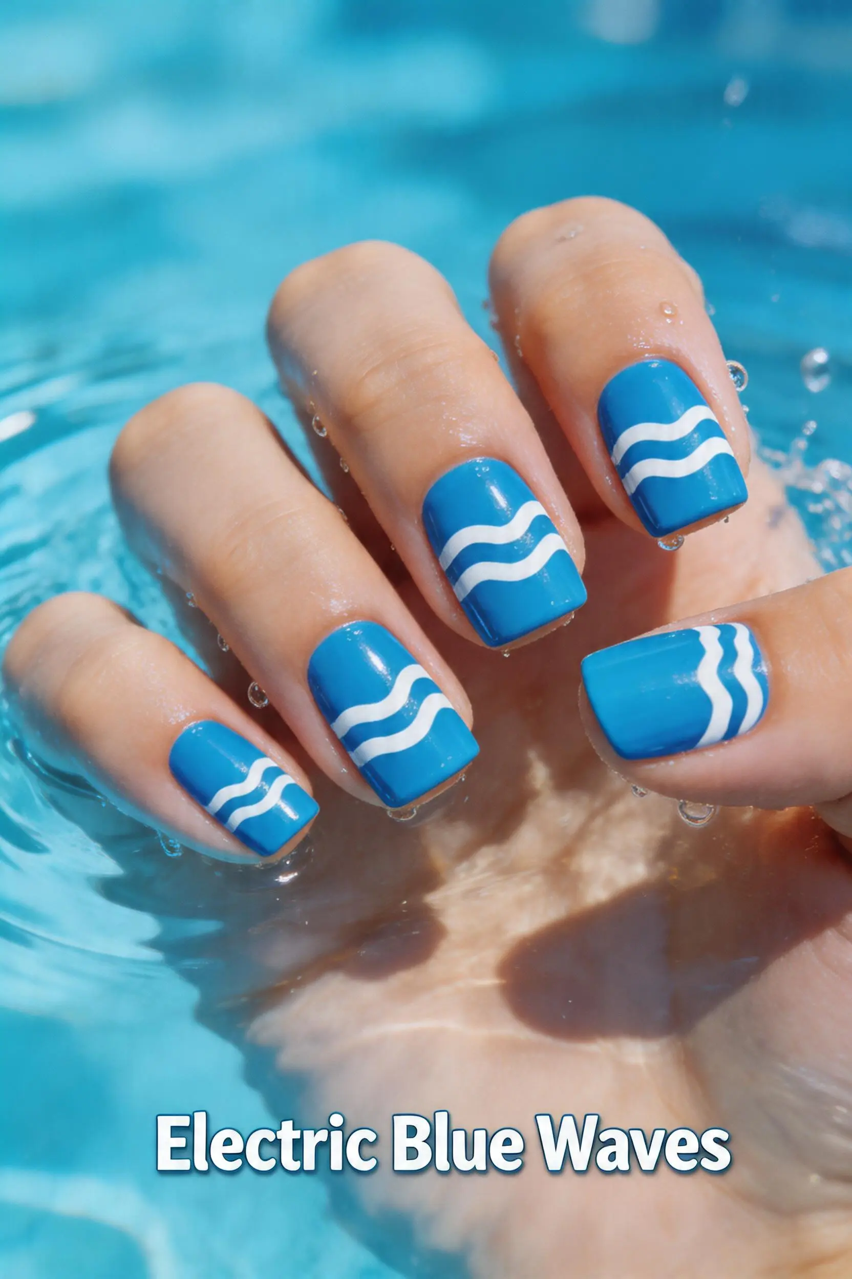 Glossy electric blue base with white wavy lines across each nail, mimicking ocean waves. Simple but striking. Perfect for beach days and pool parties.