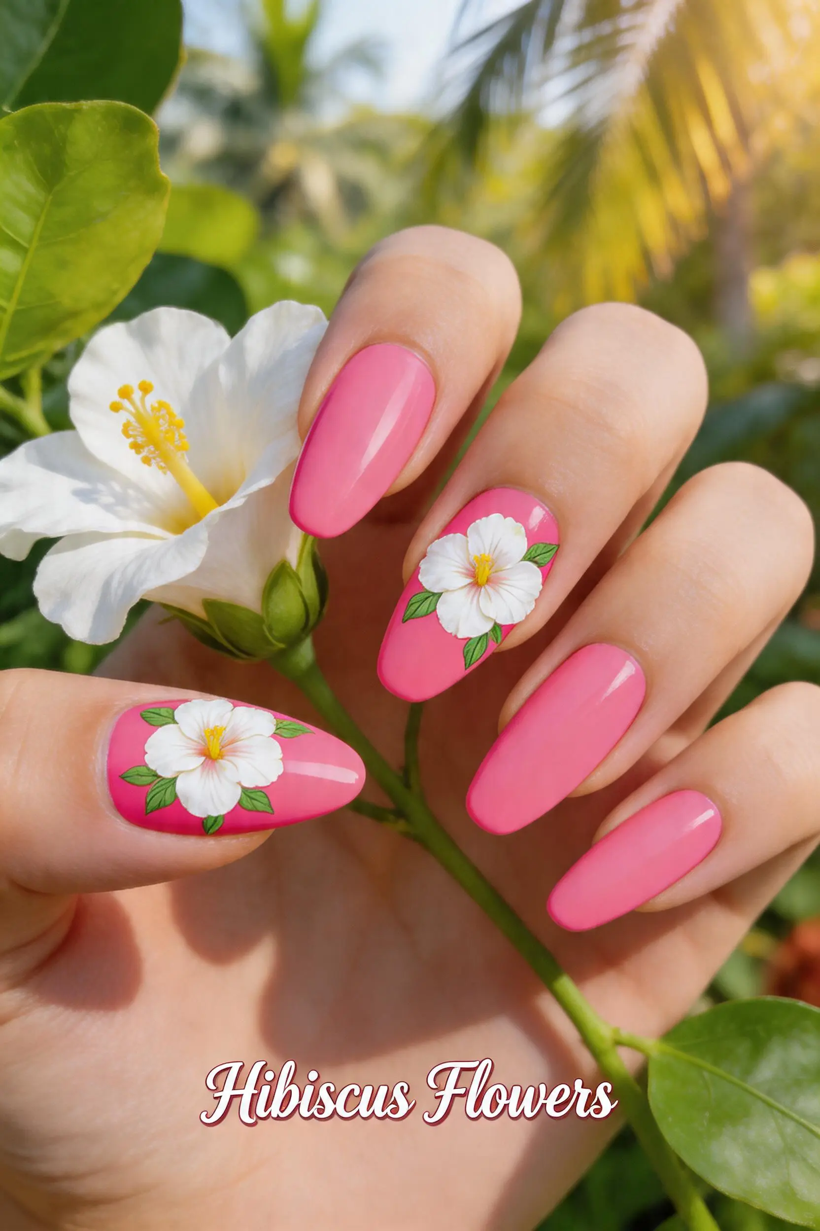 Hot pink base with large white hibiscus flowers painted on thumb and ring fingers. Yellow dots in the center of each flower. This design is bold, feminine, and instantly transports you to a Hawaiian vacation.