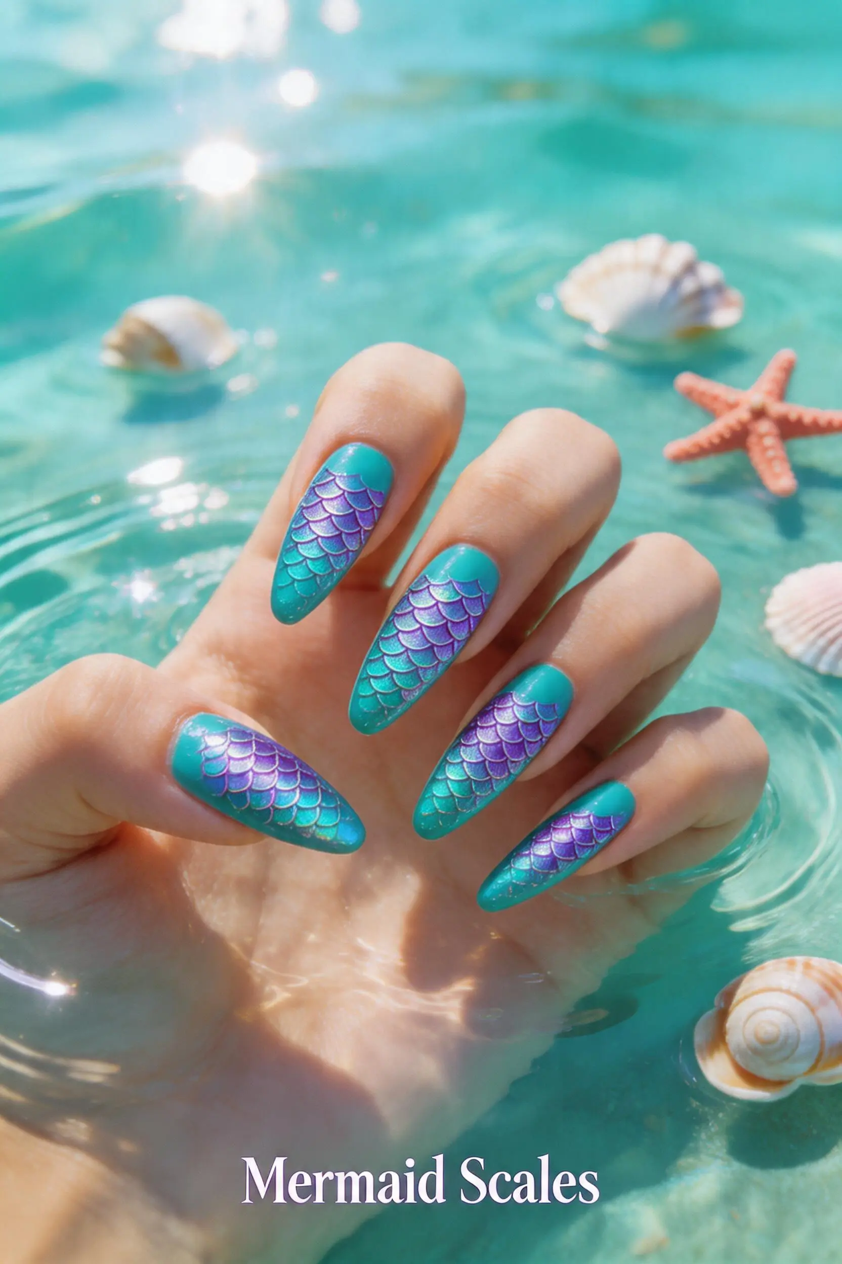 Apply a fishnet stencil over a teal base, then sponge on purple and blue glitter. Remove the stencil to reveal perfect scale patterns. This design is magical, iridescent, and perfect for mermaid lovers.