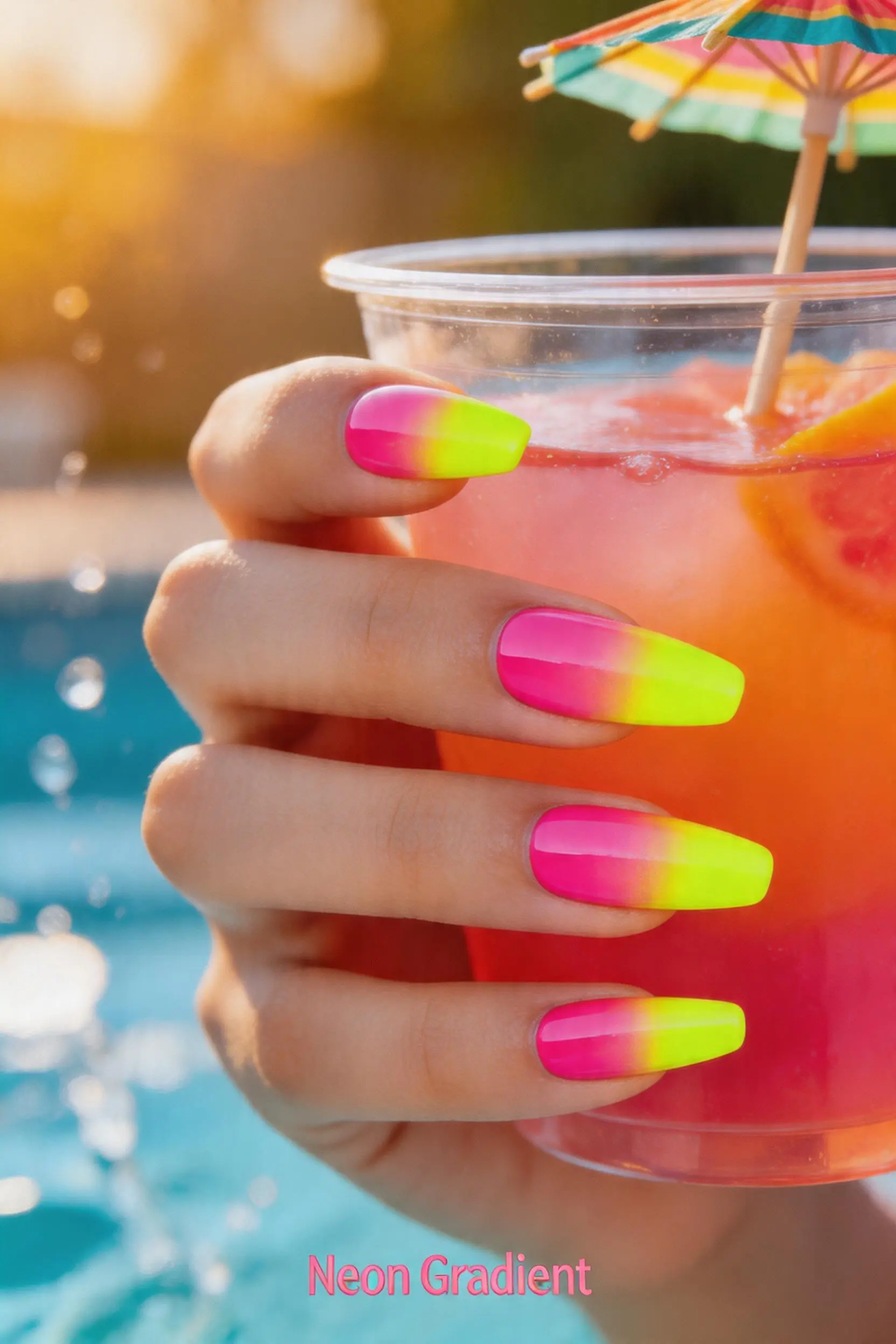 This design starts with a bright pink base at the cuticle and blends seamlessly into neon yellow at the tip. The ombré effect mimics a tropical sunrise or a candy-colored summer dream. It’s bold, unapologetic, and impossible to ignore — perfect for pool parties and music festivals.