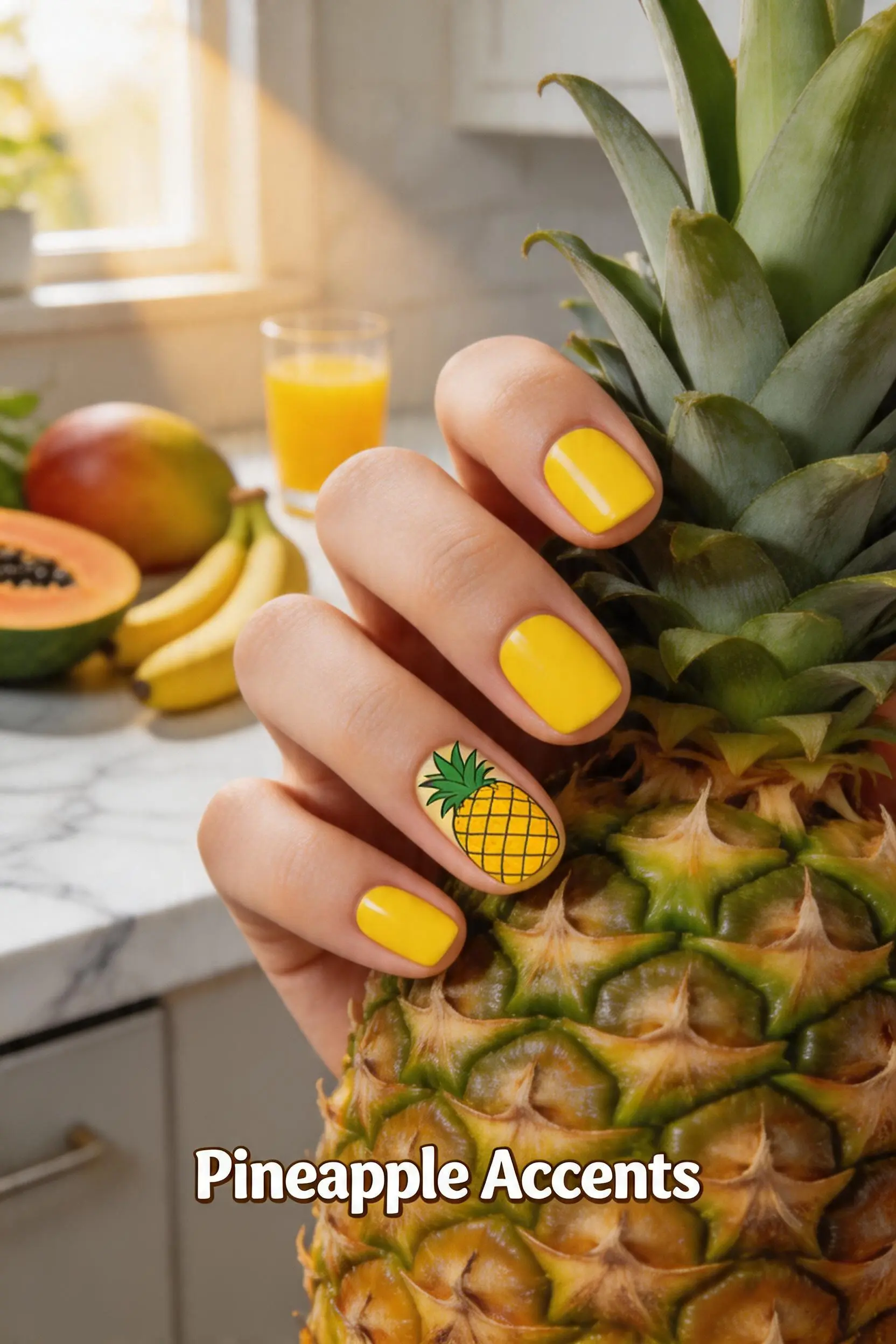 Bright yellow base on all nails, but the ring fingers get special treatment — a detailed pineapple design with green crown leaves and tiny crosshatch patterns to mimic pineapple texture. It’s cheerful, tropical, and perfect for June.