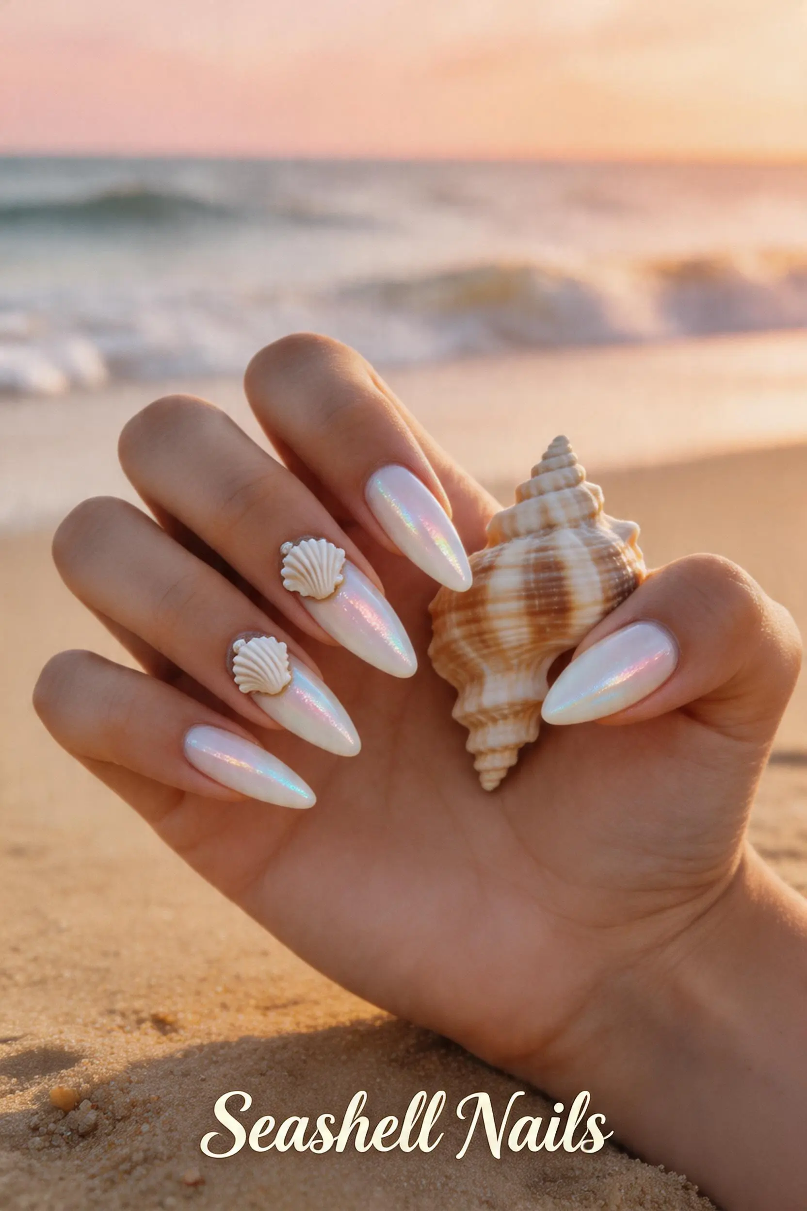 Pearlescent white base with delicate 3D seashell charms on accent nails. Some nails feature subtle iridescent shimmer that catches the light like a real seashell. This design is elegant, beachy, and perfect for June weddings or coastal vacations.