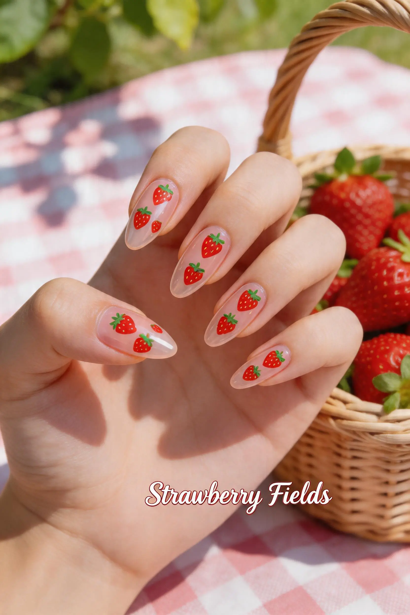 How to achieve it: Apply 2 coats of sheer pink polish. Using a dotting tool, paint tiny red teardrop shapes (strawberries). Use a thin green brush to add tiny leaf tops. Add tiny yellow dots on the strawberries for seeds.