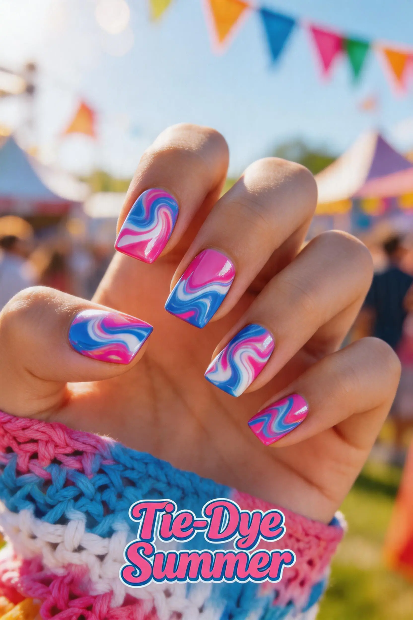 Swirls of blue, pink, and white using the water marble technique. Each nail looks like a tiny psychedelic tie-dye t-shirt. This design is perfect for music festivals, pride month celebrations, or any day you want to feel groovy.