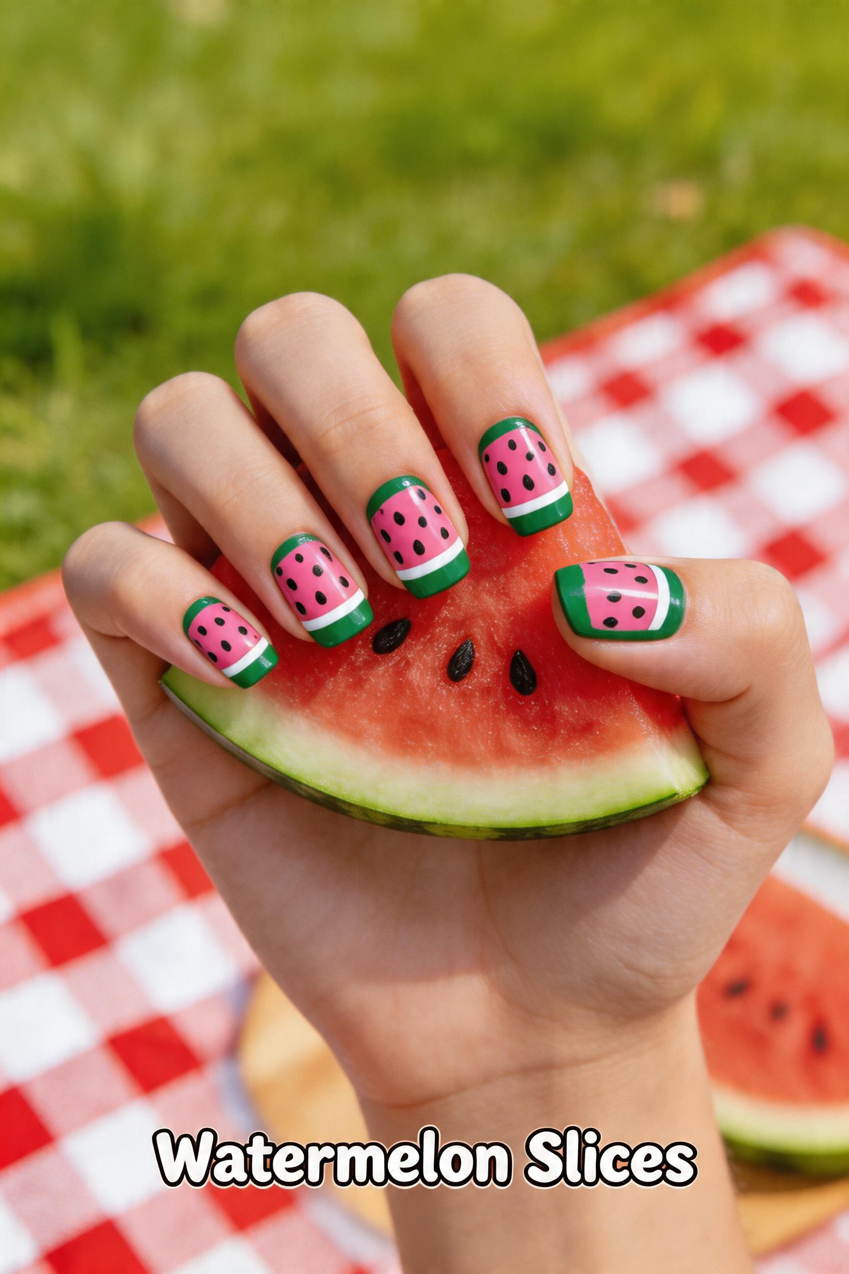 How to achieve it: Paint the entire nail pink first. Then use a thin brush to add a green curved line near the tip (like the rind). Add a thin white line between pink and green. Use a dotting tool or toothpick for tiny black seeds.